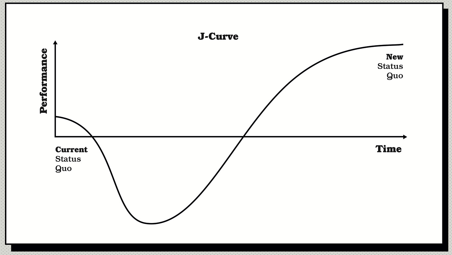 So, how do you get anybody to adopt anything? Before diving into tactics, I think it’s helpful to understand the shape of adoption itself. This brings me to a model that often bubbles up in my mind: the Productivity J-curve.